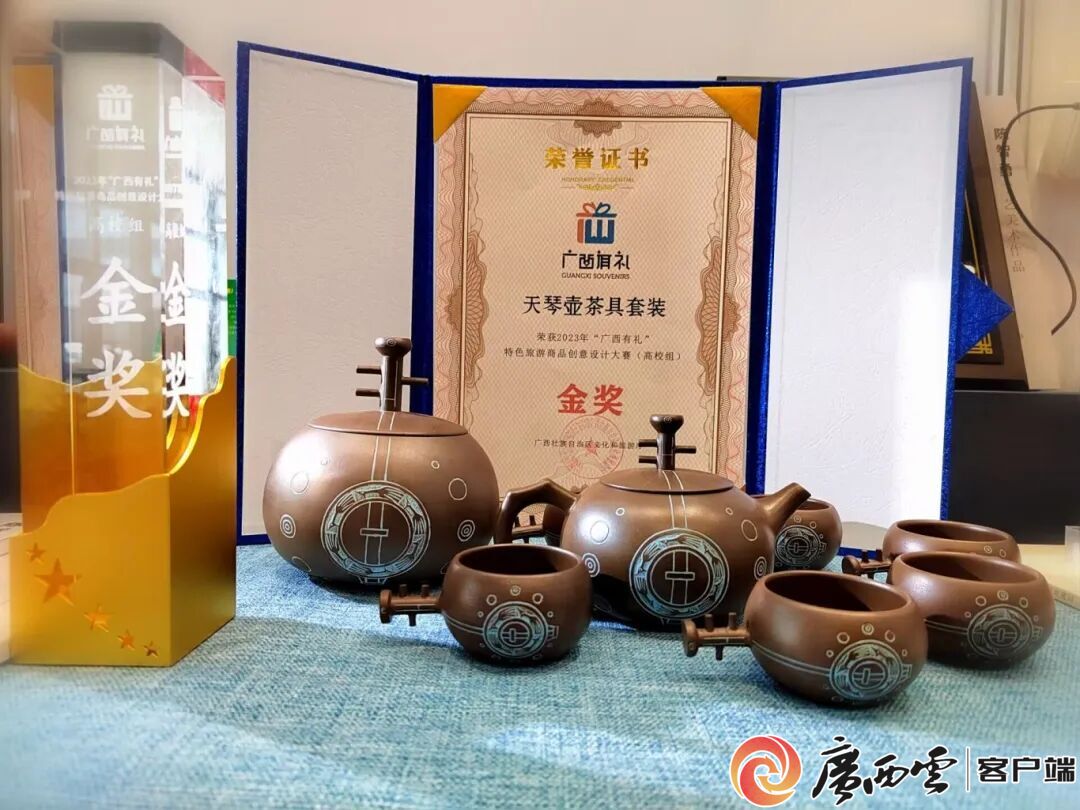 陳智勇正在專心創(chuàng)作。 從課堂講臺到陶藝工坊,從科研攻關(guān)到文化傳播,他以左江流域民族文脈為根基,以產(chǎn)教融合為路徑,在陶土的揉捏塑造中,走出了一條“以陶載道、以藝育人”的匠心之路,更彰顯了學(xué)校應(yīng)用型人才培養(yǎng)的鮮明特色。 匠心守藝 讓民族文化在陶作中重生 走進陳智勇的陶藝工作室,陶土與釉料的獨特氣息撲面而來。展架上的茶壺造型別致、底蘊深厚:天琴壺曲線靈動,壺身雕刻的壯錦圓圈紋與翔鷺紋細膩精巧,兼具民族韻味與現(xiàn)代美感;銅鼓壺紋飾古樸,藏著壯族千年銅鼓的文明密碼;花山鼓壺憨態(tài)可掬,再現(xiàn)了花山巖畫蛙人的神秘意象。 “每一件作品都帶著‘崇左印記’,這是我創(chuàng)作的初心! 陳智勇拿起一把天琴壺說道。 這份對民族元素的深耕,讓他的作品屢獲國家級、省級大獎:《一個都不能少》斬獲全國“金鳳凰”創(chuàng)新產(chǎn)品設(shè)計大賽金獎,《紫銅——唱花山》榮獲“百花杯”中國工藝美術(shù)精品獎銀獎,《天琴壺茶具套裝》摘得“廣西有禮”特色旅游商品創(chuàng)意設(shè)計大賽金獎。