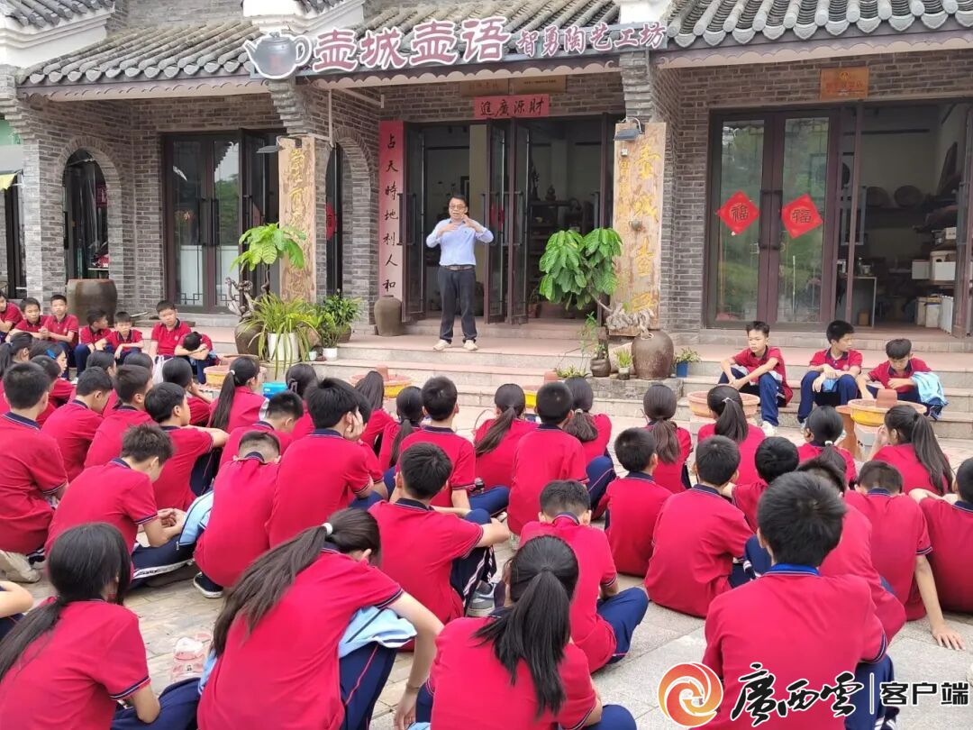 陳智勇在“陶藝進校園”活動現(xiàn)場。 文化傳承 讓邊疆匠心走向更廣闊天地 “工匠不僅要會手藝,更要懂傳承、善創(chuàng)新!鄙罡虒W(xué)與創(chuàng)作的同時,陳智勇以科研為翼,探索民族文化活態(tài)傳承之路。他主持參與廣西區(qū)級、市級科研項目12項,涵蓋左江花山巖畫研究、“一帶一路”文創(chuàng)開發(fā)、鄉(xiāng)村振興旅游產(chǎn)品設(shè)計等領(lǐng)域,始終立足崇左、扎根邊疆,為民族文化傳承提供堅實學(xué)術(shù)支撐。 在他的帶動下,崇左市工藝美術(shù)產(chǎn)業(yè)蓬勃發(fā)展:2019年牽頭成立崇左市工藝美術(shù)協(xié)會,吸納67名行業(yè)人才抱團發(fā)展;2020年,“陳智勇技能大師工作室”獲市級40萬元橫向立項,成為文旅文創(chuàng)產(chǎn)品研發(fā)核心平臺;他創(chuàng)立的“壺城壺語陳智勇陶藝工坊”,通過網(wǎng)絡(luò)直播等新媒體形式,向全國觀眾講述陶藝背后的民族故事,讓天琴壺、白頭葉猴壺等文創(chuàng)產(chǎn)品遠銷俄羅斯及東盟各國,實現(xiàn)“文化流量” 向 “產(chǎn)業(yè)銷量”的轉(zhuǎn)化。