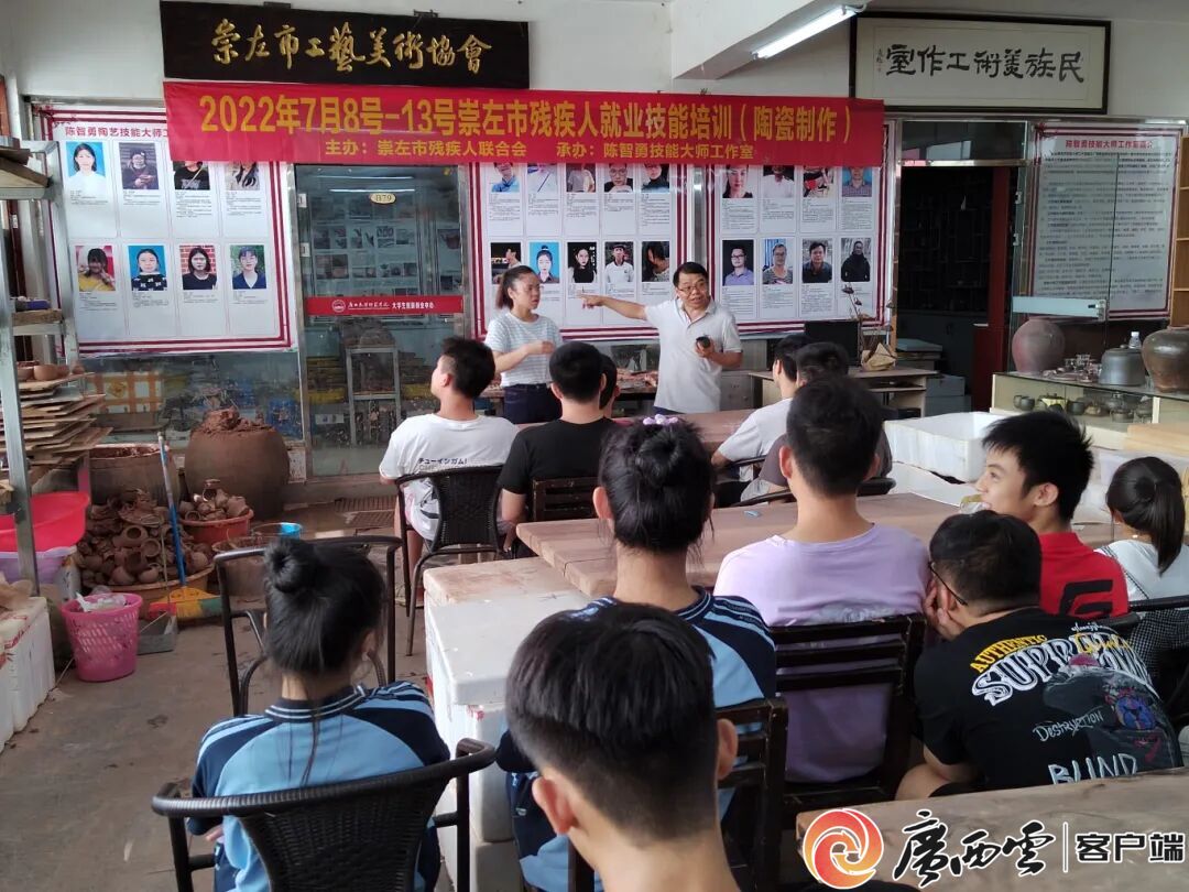 陳智勇在工作室指導(dǎo)學(xué)生。 “教育的本質(zhì)是點燃火種! 陳智勇的育人版圖不止于高校課堂。 他的陶藝工坊常年面向社會開放,累計為崇左市培訓(xùn)陶瓷技能人才 11 批次、1000 多人次,涵蓋中小學(xué)校骨干教師、殘疾人、特殊教育學(xué)校畢業(yè)生等群體;他開展“陶藝進校園”活動,走進江州區(qū)七小、江州區(qū)第三中學(xué)等學(xué)校,讓600余名中小學(xué)生在揉泥、拉坯中感受傳統(tǒng)文化魅力;他為憑祥市、龍州縣等義務(wù)教育學(xué)校美術(shù)教師開展陶瓷技能轉(zhuǎn)崗培訓(xùn),將匠心精神傳遞給基層教育工作者,形成可復(fù)制推廣的育人模式。