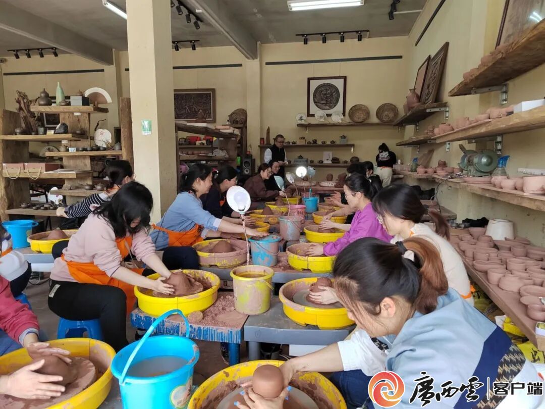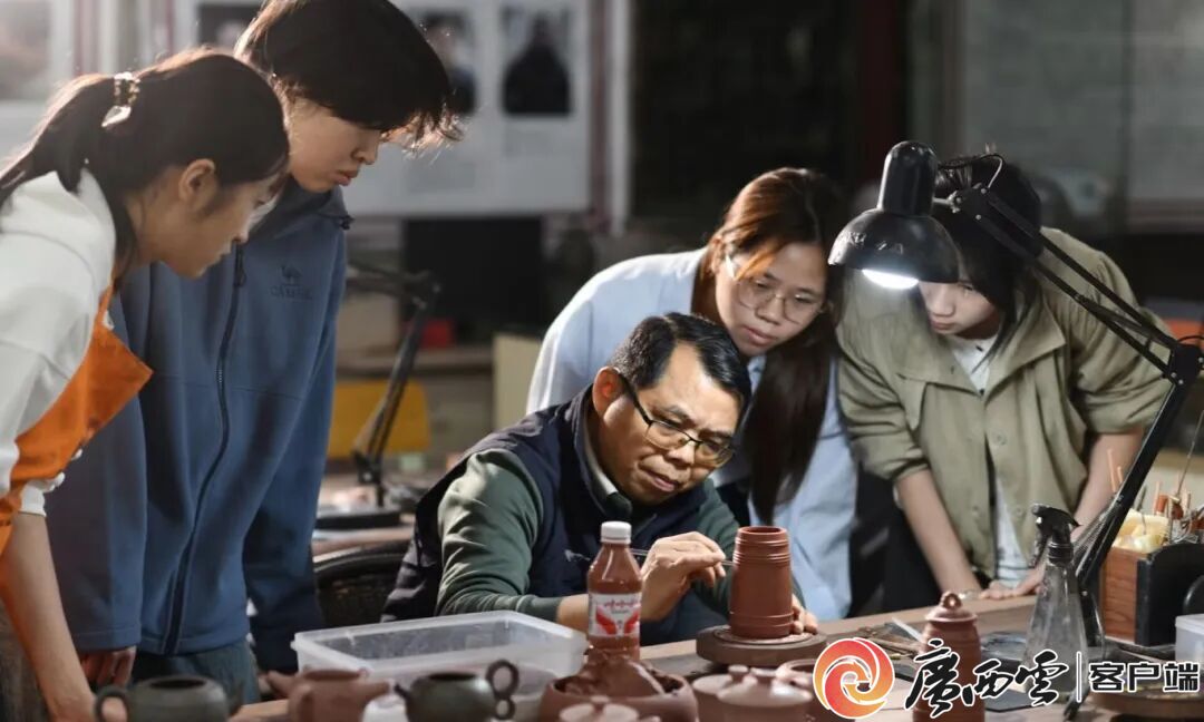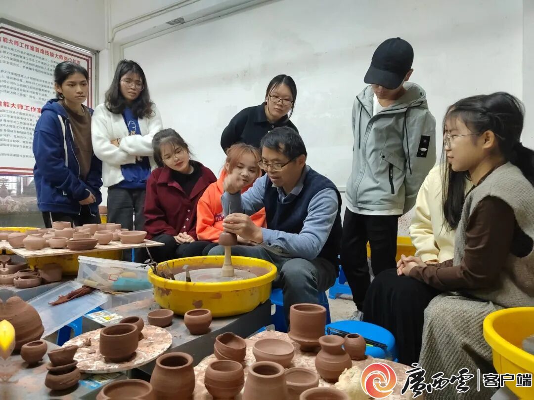 體驗陶藝制作過程。 談及未來,陳智勇眼中閃爍著光芒:“‘崇左工匠’這份榮譽,既是認可更是責(zé)任!彼媱澾M一步強化工作室團隊建設(shè),組建專業(yè)直播推廣團隊,讓更多崇左特色文創(chuàng)走向全國;同時深化產(chǎn)教融合內(nèi)涵,與更多企業(yè)共建實訓(xùn)基地,培養(yǎng)更多兼具藝術(shù)素養(yǎng)與實踐能力的技能人才,為學(xué)校應(yīng)用型人才培養(yǎng)添磚加瓦。 “我想讓每一件陶藝作品都成為民族文化的‘活化石’,讓每一位學(xué)生都能在堅守中成長、在創(chuàng)新中傳承,這便是我作為工匠和教師的初心與使命!