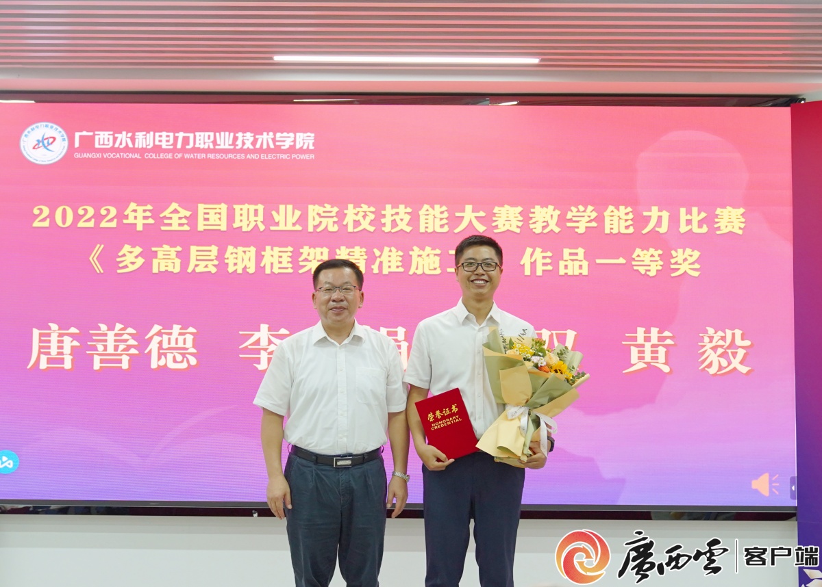 學(xué)校黨委書(shū)記李林為全國(guó)職業(yè)院校技能大賽教學(xué)能力比賽一等獎(jiǎng)教師代表頒獎(jiǎng)。 學(xué)校緊密對(duì)接國(guó)家和區(qū)域發(fā)展需求,科技創(chuàng)新與社會(huì)服務(wù)能力持續(xù)增強(qiáng)。牽頭組建廣西生態(tài)水利行業(yè)產(chǎn)教融合共同體,深度參與市域產(chǎn)教聯(lián)合體建設(shè),獲批廣西科技計(jì)劃項(xiàng)目等自治區(qū)級(jí)高水平科研項(xiàng)目5項(xiàng),實(shí)現(xiàn)零的突破。獲批廣西水利科技推廣及“工程帶科研”項(xiàng)目、南寧市科技重大專項(xiàng)項(xiàng)目等市廳級(jí)以上科研項(xiàng)目立項(xiàng)246項(xiàng)、專利授權(quán)230項(xiàng),分別增長(zhǎng)78%和109%;承擔(dān)橫向技術(shù)研發(fā)項(xiàng)目106項(xiàng),到款額總計(jì)653萬(wàn)元,增長(zhǎng)105%。建成國(guó)家級(jí)科普平臺(tái)1個(gè)、自治區(qū)級(jí)科普教育基地與眾創(chuàng)空間4個(gè)、市廳級(jí)工程技術(shù)研究中心3個(gè),獲廣西科技進(jìn)步獎(jiǎng)三等獎(jiǎng)、自治區(qū)深化創(chuàng)新創(chuàng)業(yè)教育改革示范高校等榮譽(yù)。累計(jì)開(kāi)展專題培訓(xùn)133期,完成職業(yè)技能等級(jí)認(rèn)定60項(xiàng),培訓(xùn)總量超37萬(wàn)人次,獲評(píng)全國(guó)職業(yè)院校服務(wù)全民終身學(xué)習(xí)項(xiàng)目實(shí)驗(yàn)學(xué)校、水利部少數(shù)民族地區(qū)水利人才培養(yǎng)基地、中國(guó)電力企業(yè)聯(lián)合會(huì)職業(yè)能力水平評(píng)價(jià)中心等榮譽(yù)。全力服務(wù)鄉(xiāng)村振興,幫扶6個(gè)村整村脫貧,連續(xù)四年幫扶考核獲“好”等次,獲評(píng)自治區(qū)駐村工作“先進(jìn)后盾單位”等4項(xiàng)集體榮譽(yù),4 人獲自治區(qū)級(jí)以上個(gè)人表彰。 文化特色日益彰顯,國(guó)際影響階梯躍升。學(xué)校以“上善若水 自強(qiáng)不息”校訓(xùn)為精神內(nèi)核,系統(tǒng)構(gòu)建以“善水文化”為核心的校園文化體系,完善特色文化標(biāo)識(shí)系統(tǒng),完成校院兩級(jí)IP形象設(shè)計(jì),構(gòu)建“一心一帶一環(huán)九園”環(huán)境文化格局,建成芳華園、善水廣場(chǎng)、水濂廣場(chǎng)等文化育人場(chǎng)域,獲批廣西節(jié)水教育基地。積極打造校園文化品牌,依托善水文化節(jié)、科技文化藝術(shù)節(jié)等主題文化活動(dòng),開(kāi)展理論宣講、技能比武等品牌活動(dòng)500余場(chǎng),構(gòu)筑“一校一院一特色”文化生態(tài)。新增全國(guó)志愿服務(wù)團(tuán)2個(gè)、全國(guó)大學(xué)生社團(tuán)文化風(fēng)采展示十佳社團(tuán)、百?gòu)?qiáng)社團(tuán)4個(gè),7個(gè)案例獲評(píng)全國(guó)水利職業(yè)院校水文化育人優(yōu)秀案例,入選首批廣西高校校園文化建設(shè)“一校一品”特色品牌。 積極響應(yīng)“一帶一路”倡議,主動(dòng)服務(wù)“職教出!保瑺款^組建中國(guó)—東盟能源職教聯(lián)盟,建成中柬綠色能源現(xiàn)代工匠學(xué)院和6個(gè)“桂水工坊”。中外合作辦學(xué)項(xiàng)目獲教育部備案,2項(xiàng)崗位標(biāo)準(zhǔn)獲老撾官方認(rèn)證,4項(xiàng)專業(yè)標(biāo)準(zhǔn)和課程標(biāo)準(zhǔn)獲東南亞教育部長(zhǎng)組織區(qū)域發(fā)展中心認(rèn)證,面向東盟開(kāi)展“中文+職業(yè)技能”培訓(xùn)5000余人次。實(shí)現(xiàn)學(xué)歷留學(xué)生零的突破,累計(jì)招收留學(xué)生超百名。建成“留學(xué)水院”文化交流中心等特色育人基地,培育“隔空技能大比拼”等高質(zhì)量人文交流活動(dòng)品牌,入選法國(guó)施耐德、中德合作項(xiàng)目試點(diǎn)單位,并成為全國(guó)首批“中國(guó)-東盟千校攜手計(jì)劃”院校,榮獲“中國(guó)-東盟職教卓越伙伴”、中國(guó)高等職業(yè)院校國(guó)際化發(fā)展活力百?gòu)?qiáng)榜單(第52位)等國(guó)際榮譽(yù)19項(xiàng),國(guó)際辦學(xué)影響力實(shí)現(xiàn)階梯式躍升。