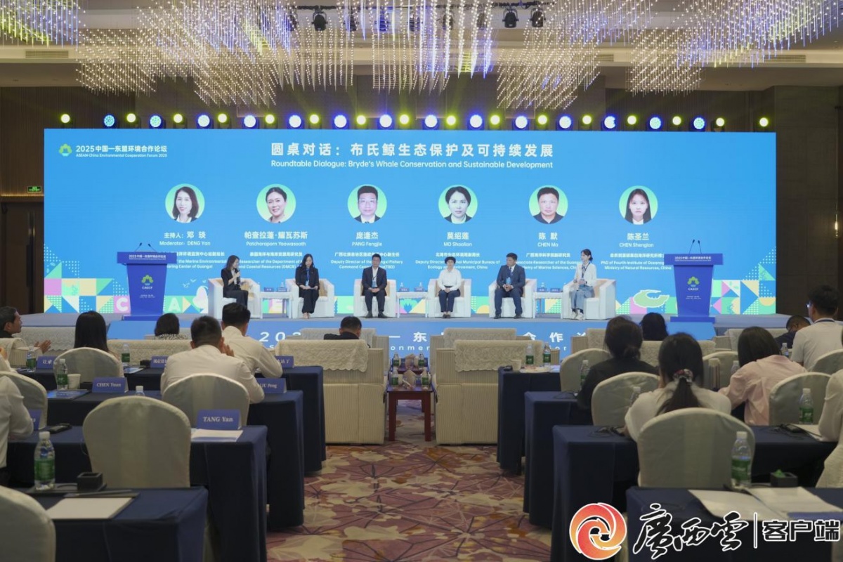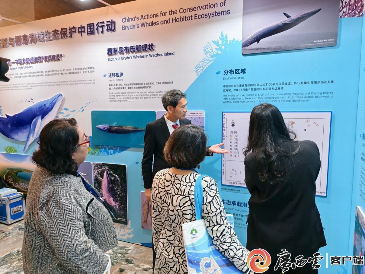 向東盟國家的專家學(xué)者介紹布氏鯨監(jiān)測與保護(hù)的成果。廣西海洋站供圖 10月21日,2025中國—東盟環(huán)境合作論壇平行論壇“布氏鯨近海海域棲息地生態(tài)環(huán)境保護(hù)與可持續(xù)發(fā)展對話”在北海市舉辦。中國與來自泰國、馬來西亞、聯(lián)合國開發(fā)計(jì)劃署等多位專家學(xué)者,分享最新科研成果與實(shí)踐經(jīng)驗(yàn),共同探討全球近岸海域布氏鯨保護(hù)的熱點(diǎn)問題和布氏鯨研究與保護(hù)工作的跨境協(xié)作,為推動布氏鯨棲息地生態(tài)環(huán)境保護(hù)協(xié)同發(fā)展出謀劃策,助力中國—東盟海洋生態(tài)環(huán)境保護(hù)國際合作與海洋命運(yùn)共同體建設(shè)。 會上,廣西海洋站還展示了中國開展的布氏鯨保護(hù)行動取得的成果,并向參會人員發(fā)放了中英版觀鯨護(hù)鯨指南。