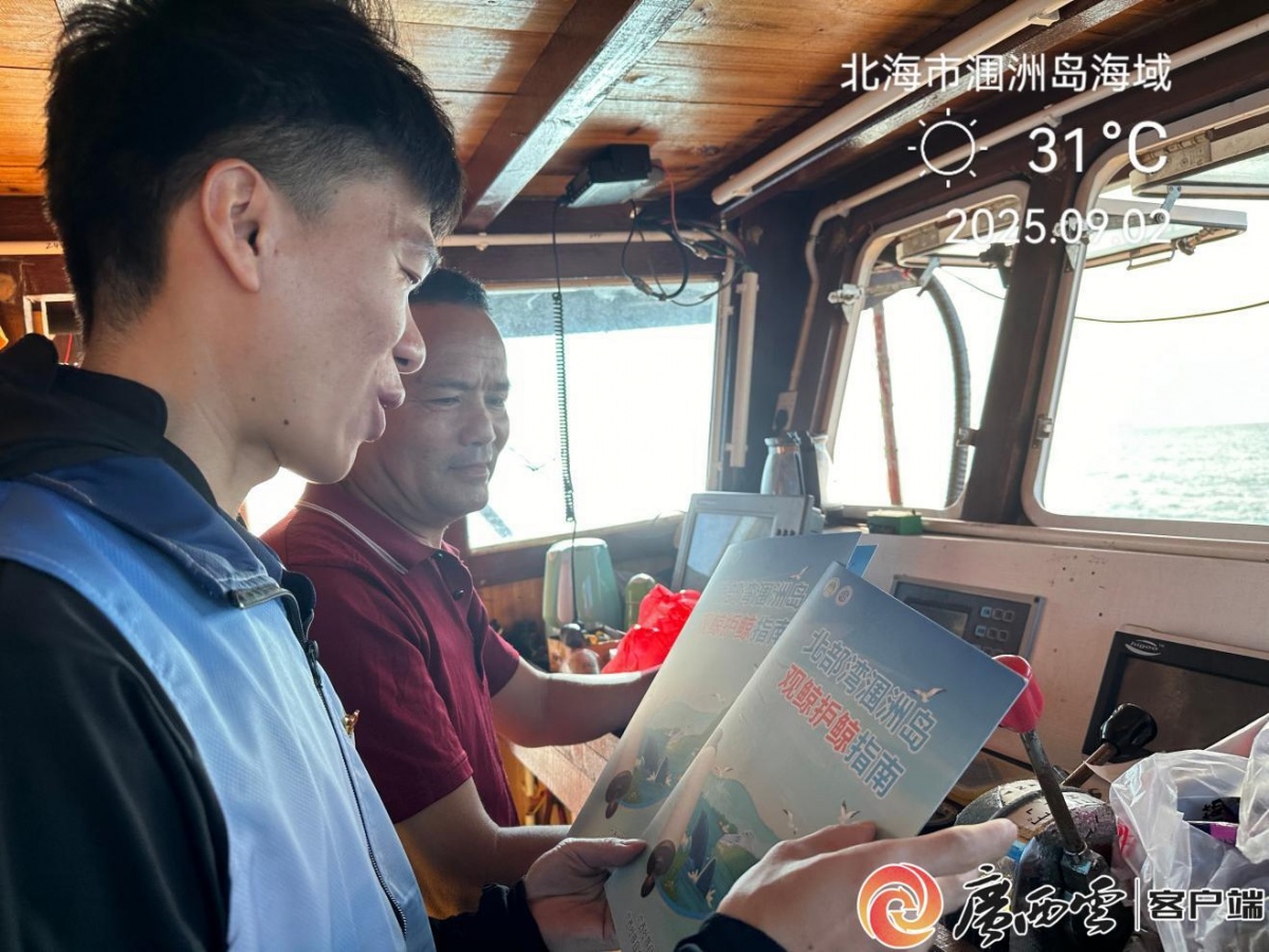 與東盟國家的學(xué)者共同探討布氏鯨研究與保護(hù)工作的跨境協(xié)作。廣西海洋站供圖 漁港與景區(qū):從觀鯨到護(hù)鯨的觀念轉(zhuǎn)變 廣西海洋站在漁業(yè)資源調(diào)查的同時,積極組織科普工作隊(duì)員深入潿洲島、三娘灣等景區(qū),以及漁港碼頭等地開展布氏鯨保護(hù)科普宣傳。 “阿叔,咱們出海捕撈作業(yè)的時候,要盡可能遠(yuǎn)離布氏鯨經(jīng);顒訁^(qū)域,不要向海中丟棄塑料垃圾、漁網(wǎng)等,這些會對鯨魚造成嚴(yán)重的傷害……”科普工作隊(duì)員深入漁港,耐心給漁民講解漁船如何規(guī)避鯨類活動區(qū)、如何減少丟棄漁具。