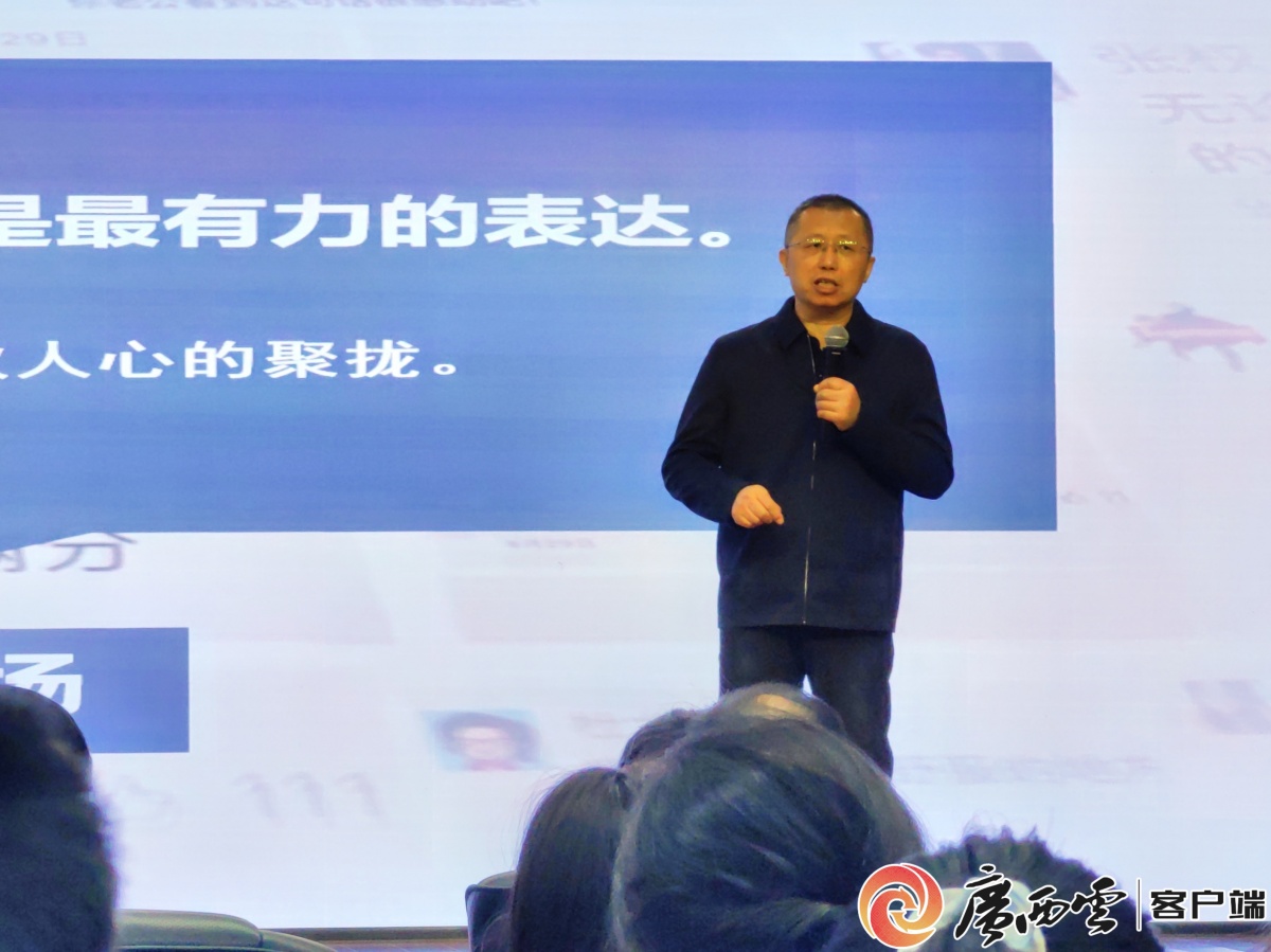揚(yáng)州日報(bào)原副總編拾景炎。覃海明 攝 兩個(gè)多小時(shí)的報(bào)告會,掌聲雷動(dòng),經(jīng)久不息。8位記者真摯的語言、鮮活的案例,激勵(lì)了現(xiàn)場的每一個(gè)人。在座談交流環(huán)節(jié),南寧市黨政機(jī)關(guān)、宣傳思想文化單位、廠礦企業(yè)、社區(qū)居民與大學(xué)生等觀眾代表就“如何在新媒體環(huán)境下做好深度報(bào)道”及圍繞“新聞理想與職業(yè)選擇”踴躍提問。巡講團(tuán)成員結(jié)合自身經(jīng)歷一一解答,與大家進(jìn)行熱烈互動(dòng)。 據(jù)悉,“新時(shí)代・好記者”全國巡講活動(dòng)旨在發(fā)揮優(yōu)秀新聞工作者的示范引領(lǐng)作用,謳歌時(shí)代精神,傳承新聞理想,激發(fā)職業(yè)熱情,此次廣西巡講活動(dòng),大大激勵(lì)了廣大新聞工作者和高校新聞學(xué)子。南寧市融媒體中心青年記者郭少東表示,要以8位優(yōu)秀記者為榜樣,做到腳下有泥,心中有光,筆下有雷,眼里有淚!皬闹卮笾黝}的深度報(bào)道到民生一線的暖心紀(jì)事,從突發(fā)事件的快速響應(yīng)到鄉(xiāng)村振興的生動(dòng)記載,從家國敘事的宏大篇章到凡人微光的細(xì)膩刻畫,他們都充分展現(xiàn)了新時(shí)代新聞工作者應(yīng)具備的良好精神風(fēng)貌!”