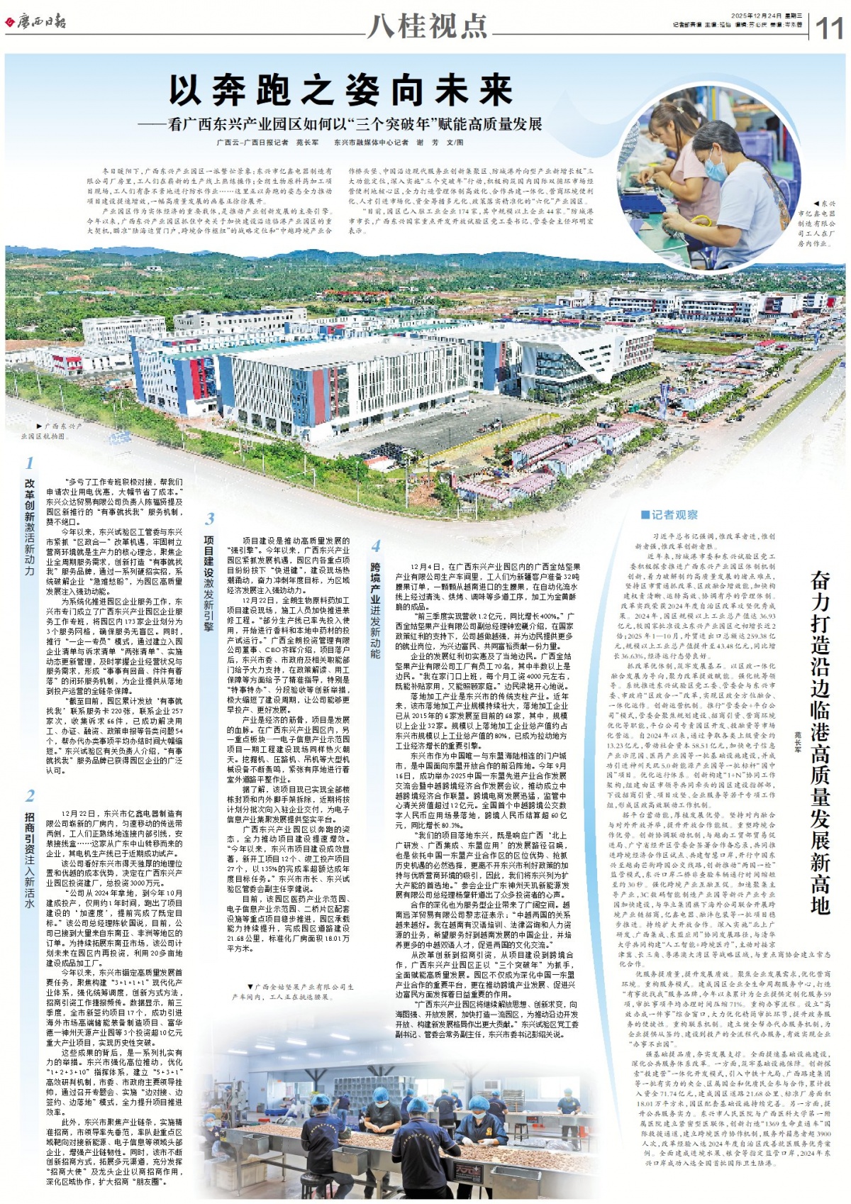 12月24日廣西日報要聞版“1+1”報道。 【消息報道】 廣西東興產業(yè)園區(qū)建設熱潮涌動1—10月規(guī)上工業(yè)總產值達43.48億元,同比增長36.63%12月22日,在廣西東興產業(yè)園區(qū)的電子信息產業(yè)示范園內,大型機械設備轟鳴作響,工程機械往來穿梭,工人們緊張作業(yè),展現(xiàn)出一派繁忙的建設景象。 廣西東興產業(yè)園區(qū)展現(xiàn)出一派繁忙的建設景象。記者 苑長軍 通訊員 沈茜靈 攝制 重大項目是擴投資、穩(wěn)增長的重要引擎和有力抓手。2024年以來,廣西東興產業(yè)園區(qū)通過爭取專項債券、邊境轉移支付資金、中央預算內資金等各類上級資金約13.23億元,帶動社會資本58.51億元,完成園區(qū)道路建設21.68公里,標準化廠房建設18.01萬平方米,成功引進神州天璣5.0新能源產業(yè)園、3C數(shù)碼智能制造產業(yè)園等一批標桿“園中園”項目。 今年,廣西東興國家重點開發(fā)開放試驗區(qū)和東興市持續(xù)深化“三個突破年”行動,提速推進廣西東興產業(yè)園區(qū)和重大項目建設各項工作,以精準服務破難題、以協(xié)同發(fā)力促提升,集中精力抓項目、強產業(yè)、謀發(fā)展,以實干實效為東興市經濟社會高質量發(fā)展蓄勢賦能。 截至目前,廣西東興產業(yè)園區(qū)今年新簽約產業(yè)項目達21個,協(xié)議總投資額140.23億元,其中超10億元項目5個,初步形成“優(yōu)勢互補、要素聯(lián)動、成果共享”的區(qū)域協(xié)同發(fā)展格局!2024年,園區(qū)規(guī)上工業(yè)總產值達36.93億元,同比增長28.15%,較國家批準設立東興產業(yè)園區(qū)之初增長近2倍;2025年1—10月,園區(qū)規(guī)上工業(yè)總產值進一步提升至43.48億元,同比增長36.63%!狈莱歉凼惺虚L,廣西東興國家重點開發(fā)開放試驗區(qū)黨工委書記、管委會主任邱明宏介紹。 【深度調查】 以奔跑之姿向未來——看廣西東興產業(yè)園區(qū)如何以“三個突破年”賦能高質量發(fā)展■廣西云-廣西日報記者 苑長軍 東興市融媒體中心記者 謝芳 文/圖 冬日暖陽下,廣西東興產業(yè)園區(qū)一派繁忙景象:東興市億鑫電器制造有限公司廠房里,工人們在嶄新的生產線上熟練操作;全朗生物原料藥加工項目現(xiàn)場,工人們有條不紊地進行防水作業(yè)……這里正以奔跑的姿態(tài)全力推動項目建設提速增效,一幅高質量發(fā)展的畫卷正徐徐展開。