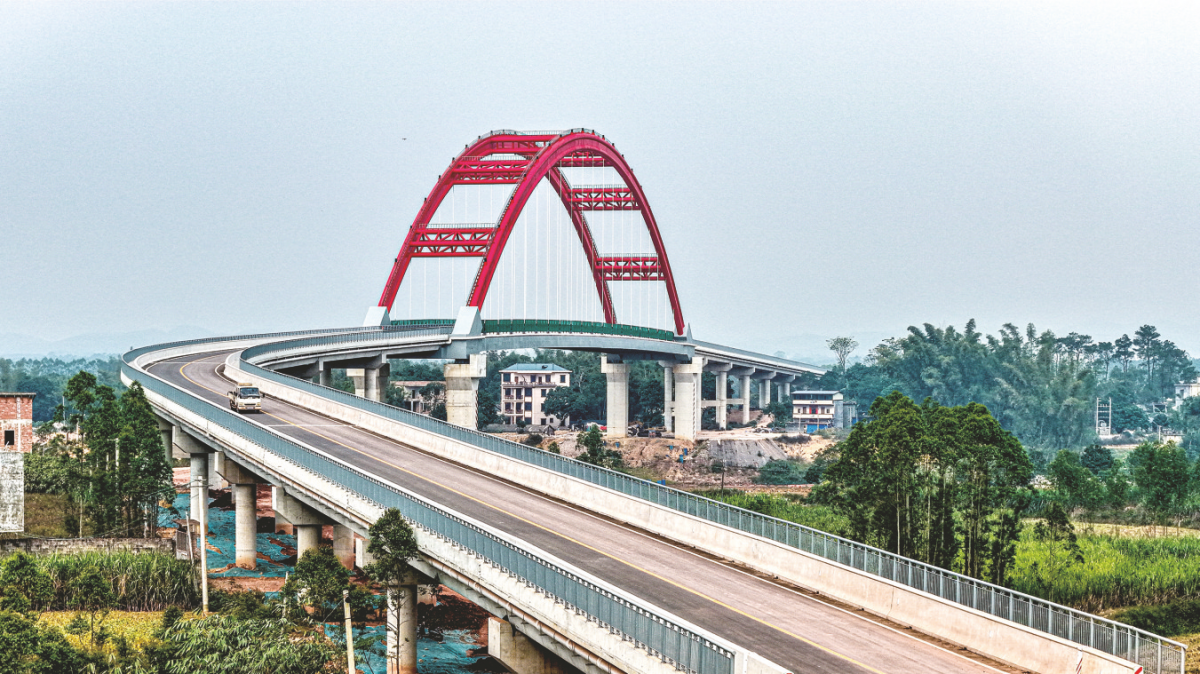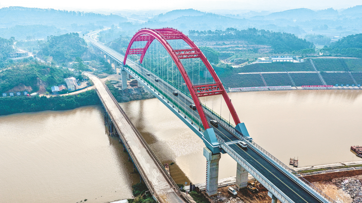 平陸運(yùn)河丁屋村大橋。平陸運(yùn)河集團(tuán)供圖 此次通車的兩座橋梁,雖定位不同卻同樣承載著民生期盼。其中,丁屋村大橋位于欽州市以北約23公里的久隆鎮(zhèn)附近,為原位重建項(xiàng)目,是省道S313跨越欽江的重要交通樞紐。橋梁全長932.08米,主橋?yàn)?75米下承式鋼管混凝土系桿拱,拱肋采用啞鈴型斷面設(shè)計(jì);橋面總寬12米,兩側(cè)配套設(shè)置人行道,采用雙向兩車道二級(jí)公路標(biāo)準(zhǔn)建設(shè),設(shè)計(jì)時(shí)速60公里,將成為串聯(lián)區(qū)域主干道、保障群眾快速通行的關(guān)鍵節(jié)點(diǎn)。 與丁屋村大橋相鄰的相思大橋,坐落于久隆鎮(zhèn)黎屋村與平吉鎮(zhèn)相思坪村交界處,為異位重建項(xiàng)目,聚焦鄉(xiāng)村互聯(lián)互通需求,是連接相鄰村鎮(zhèn)、暢通“最后一公里”的民生橋梁。該橋全長992.08米,主橋同樣采用175米下承式鋼管混凝土系桿拱結(jié)構(gòu),橋面總寬12米并配套人行道,采用雙向兩車道四級(jí)公路標(biāo)準(zhǔn),設(shè)計(jì)時(shí)速20公里,精準(zhǔn)匹配村鎮(zhèn)間日常通行需求,將徹底改善沿線村民跨江出行的不便。