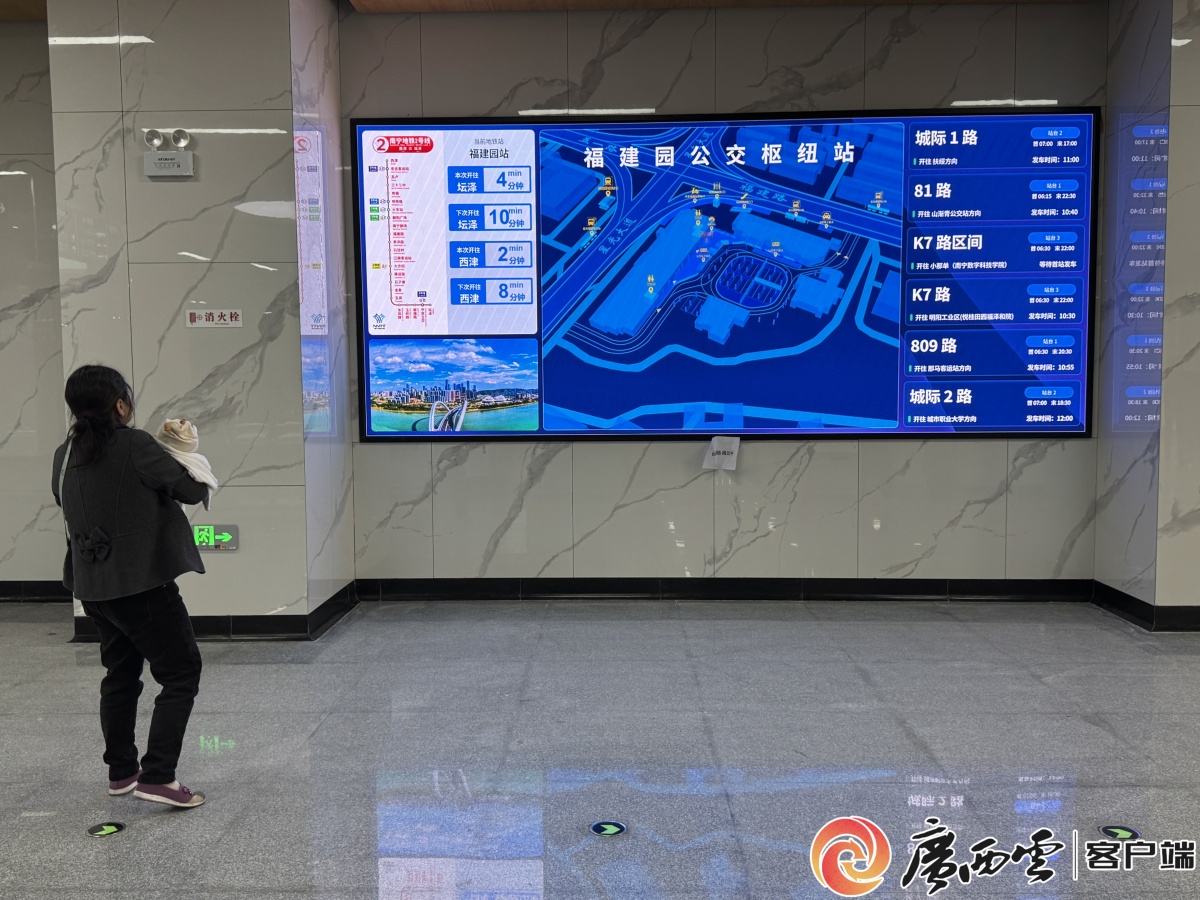今日的廣西日報南寧觀察版頭條關注AI賦能南寧公共交通建設情況。 12月21日,冬至日。南寧市福建園公交樞紐車水馬龍,家住亭洪路的市民黃阿姨手提水果禮品,大步走來!耙粋多小時就到扶綏縣了,這趟城際公交車比汽車站大巴實惠很多!秉S阿姨走到樞紐互動屏前,一邊與鄉(xiāng)親們分享返鄉(xiāng)心得,一邊用手指劃動互動屏,查看城際2路公交車行駛路線和?空军c。 視頻攝制:沈程 南寧市民在福建園公交樞紐互動屏前查看站點信息,等候乘車。廣西云-廣西日報記者 沈程 攝 “車來了,快快快!”當日返回扶綏縣過節(jié)的人流匆匆,抱著孩子的婦女、手提果蔬的鄉(xiāng)親、肩背行李的游客,他們乘坐電梯從地下一層福建園地鐵站緩緩升到地面,徑直走向福建園公交樞紐候車。隨著公交車輛有序開關車門,乘客先后落座,返鄉(xiāng)城際公交隨即啟程。 記者在福建園公交樞紐看到,不僅是站點前的互動屏,身后的智慧大屏也清晰展示了地鐵到站信息、公交線路發(fā)車方向,為乘客地鐵與公交無縫換乘提供實用參考信息。 市民在福建園公交樞紐大屏前查看站點信息。廣西云-廣西日報記者 沈程 攝 地鐵與公交如何能實現(xiàn)絲滑換乘?關鍵就在于這個能將地鐵與公交運營融合聯(lián)動的“智慧大腦”——全國首創(chuàng)的“地鐵+公交”協(xié)同智慧調(diào)度系統(tǒng)。南寧軌道交通投資集團公共交通融合工作專班辦公室副主任何家輝介紹,這套基于AI技術構建的“指揮中樞”,可以通過智能調(diào)度,讓南寧地鐵與公交的聯(lián)動愈發(fā)精準高效,為人們提供“地鐵到站、公交接駁”的優(yōu)質(zhì)、便捷、高效出行服務。