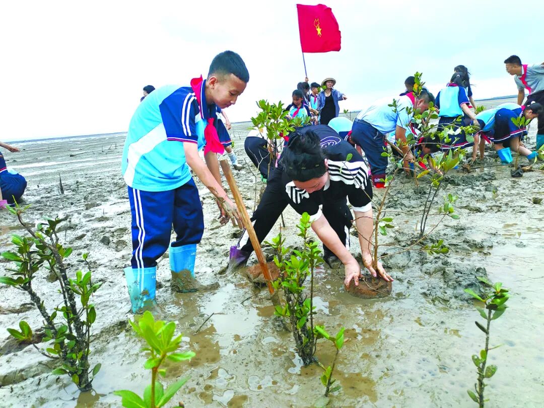 紅樹(shù)林蓬勃生長(zhǎng)。 紅樹(shù)林,總書(shū)記念茲在茲,防城港人朝斯夕斯。 保護(hù)紅樹(shù)林就是保護(hù)自己的家園,就是造福子子孫孫。69年來(lái),從稚童到老者,幾代人接力;年?duì)I收超千億元企業(yè)的管廊項(xiàng)目因紅樹(shù)林被擱置;法院創(chuàng)新判決引入“生境修復(fù)”理念……全民愛(ài)林,全城護(hù)林,守護(hù)的信念如紅樹(shù)林的根系深入大地,深植于防城港人心中。 如今的防城港越來(lái)越綠,人居環(huán)境越來(lái)越好。從一棵苗到一片林,從一個(gè)村落到一項(xiàng)國(guó)際事業(yè)。防城港紅樹(shù)林保護(hù)實(shí)踐成為生態(tài)治理“中國(guó)方案”的重要組成部分。這片不斷生長(zhǎng)的綠色,無(wú)愧于全球環(huán)境基金三大紅樹(shù)林國(guó)際示范區(qū)之一的美譽(yù)。 69年接力共植一片紅樹(shù)林 紅樹(shù)林是“國(guó)寶”,要像愛(ài)護(hù)眼睛一樣守護(hù)好……要堅(jiān)持綠色發(fā)展,一代接著一代干,久久為功,建設(shè)美麗中國(guó),為保護(hù)好地球村作出中國(guó)貢獻(xiàn)。 ——2023年4月10日,習(xí)近平總書(shū)記在廣東湛江考察時(shí)就紅樹(shù)林保護(hù)作出重要指示 “小時(shí)候,是老師給我科普紅樹(shù)林知識(shí),現(xiàn)在是我?guī)е鴮W(xué)生去種樹(shù)。”防城區(qū)江山鎮(zhèn)中心小學(xué)少先隊(duì)輔導(dǎo)員陸建伶,站在當(dāng)年自己種下的紅樹(shù)林旁,看著孩子們?cè)韵碌男旅纾牢康卣f(shuō),“當(dāng)年種樹(shù)時(shí),沒(méi)想過(guò)自己會(huì)成為接力中的一員!