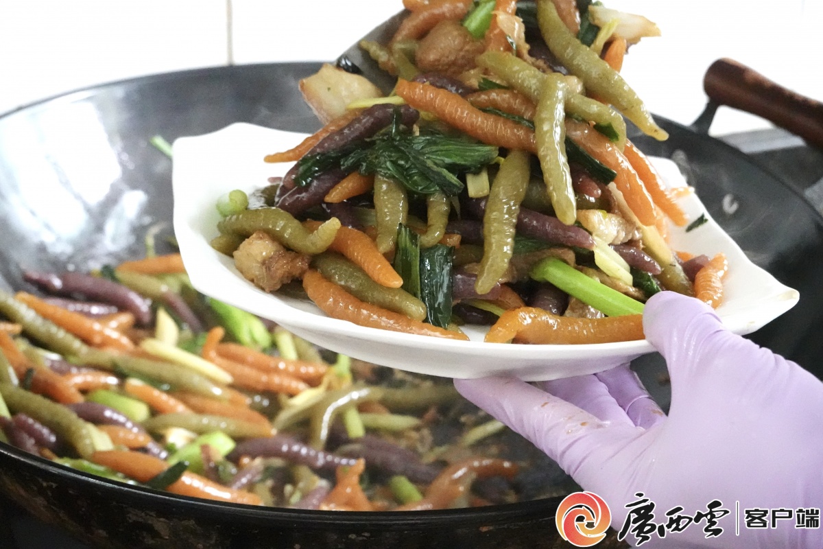 三色蠶蟲糍出鍋的瞬間,香氣撲面而來。林璐 攝 隨后,謝雪萍將生坯上鍋蒸制十分鐘左右,熱氣升騰間,糍體漸漸變得鮮艷晶瑩。隨后,她起鍋熱油,將蒸好的蠶蟲糍與新鮮豬肉、時令蔬菜一同下鍋快速翻炒。出鍋瞬間,香氣撲面而來。 “我覺得這個三色蠶蟲糍口味很豐富,很彈牙,比傳統(tǒng)的蠶蟲糍好吃!睂W生朱恩駿品嘗了三色蠶蟲糍后對記者說。 這款三色蠶蟲糍既保留了昭平蠶蟲糍的核心風味,又通過天然食材的創(chuàng)新搭配,使老味道煥發(fā)了新生機,這份承載著鄉(xiāng)土記憶的傳統(tǒng)美味,正在新時代收獲更多人的喜愛與認可。 |