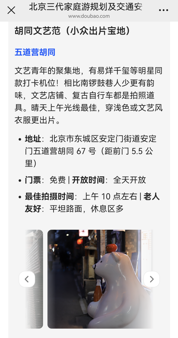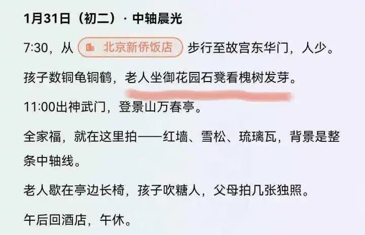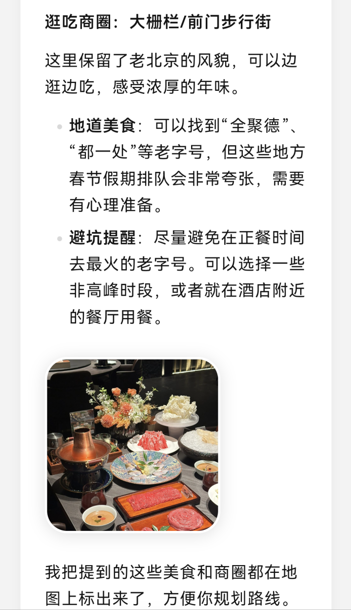 AI生成的美食和商圈推薦 “別看圓周旅跡的線路規(guī)劃謹(jǐn)慎得像教科書,但是只有它推薦了一個連很多‘老北京’都不知道的地方——93號博物館,后來我們真的去了。在那里,三代人都玩得很開心,還沒有擁擠的感覺。”黃俊輝告訴記者。 “因為AI提供的內(nèi)容是總結(jié)來的,不是實地走出來的。行程真正落地,是否真的能在景山萬春亭‘自然獲得’30分鐘安靜時間?是否真的能在前門網(wǎng)紅餐廳實現(xiàn)‘排隊小于20分鐘’?AI無法保證!崩铥愓f,當(dāng)她看到AI建議她和老伴坐在故宮御花園石凳看槐樹發(fā)芽時,笑得直不起腰來。