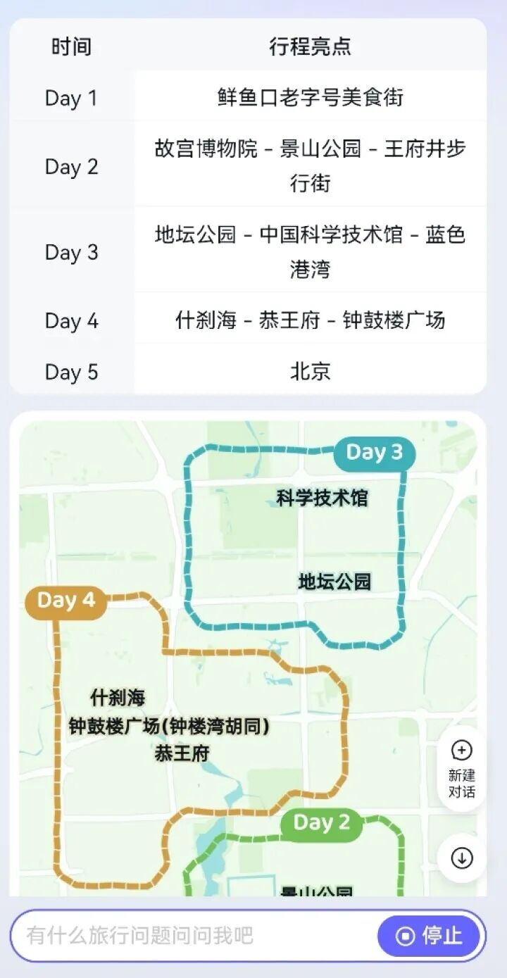 AI生成的行程亮點(diǎn) “但每個AI做的就是在‘骨架’上,嘗試為不同家庭成員‘添肉’。”黃俊輝舉例道,豆包會在每一天的行程里,明確劃分出“老人休息點(diǎn)”“孩子互動點(diǎn)”“父母獨(dú)處時間”,甚至精確到“30分鐘”。這就是算法對“家庭旅行想法”的總結(jié)。對AI有些研究的他說:“當(dāng)系統(tǒng)識別‘90后’時,會調(diào)用‘親子挑戰(zhàn)’‘家庭幸福感’標(biāo)簽庫;識別‘60后’時,則激活‘懷舊’‘慢節(jié)奏’數(shù)據(jù)簇! 至于誰更懂誰?周歡歡問過全家人的想法,豆包用“鐺鐺車運(yùn)營時段”“網(wǎng)紅餐廳避開高峰的時間點(diǎn)”等細(xì)節(jié)俘獲了她和愛人;程心AI以“茶館聽評書”撥動了兩位老人的心弦;點(diǎn)點(diǎn)和圓周旅跡憑“小眾目的地打卡”成為她和孩子的靈感庫。飛豬問一問的方案略顯“電商思維”,但推薦的中國科技館,雖不屬于中軸線景點(diǎn),也讓孩子有不少收獲。