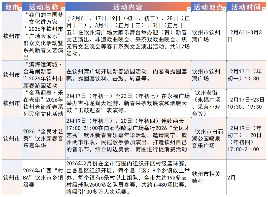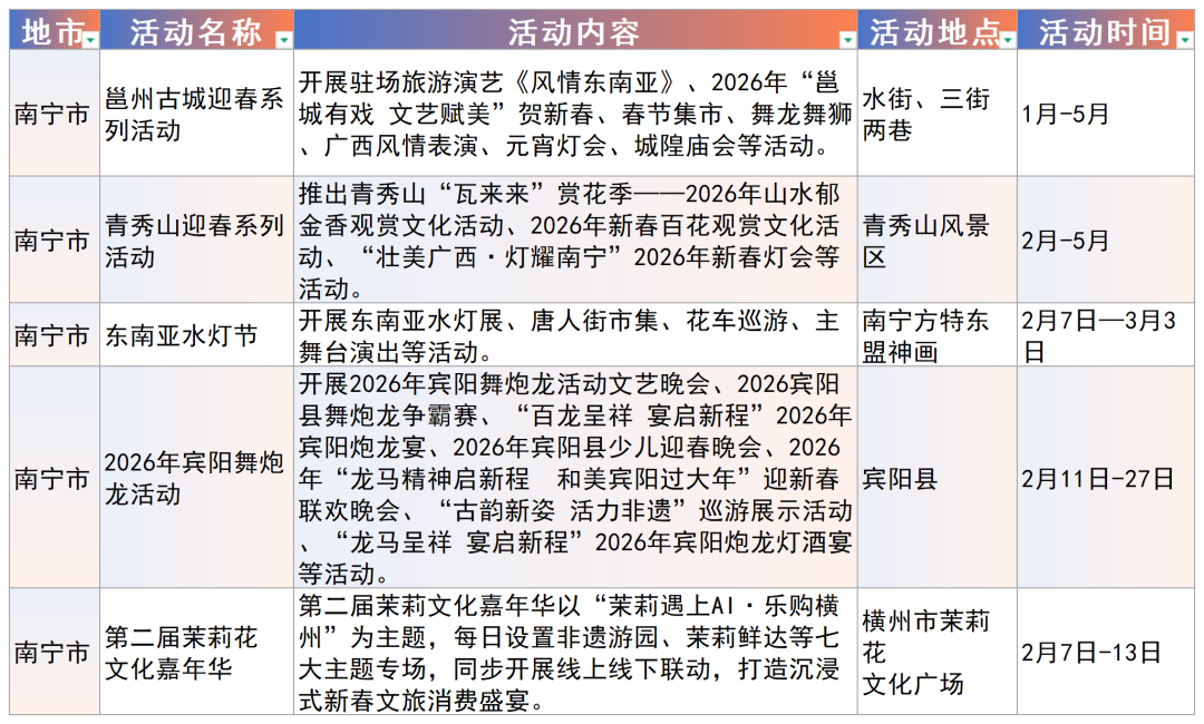 2026年春節(jié)來臨之際,廣西全區(qū)各地將推出多項文旅活動,從都市到鄉(xiāng)村,處處洋溢節(jié)日氛圍!活動既有廟會、舞龍舞獅、戲曲等傳統(tǒng)民俗,又有藝術(shù)展覽、樂園游玩等創(chuàng)新體驗。近日,自治區(qū)文化和旅游廳發(fā)布各地新春文旅活動安排預告,帶你感受廣西魅力,開啟新春歡樂之旅。 ★活動詳情以當?shù)刈钚鹿夹畔闇省?/span> 南寧市