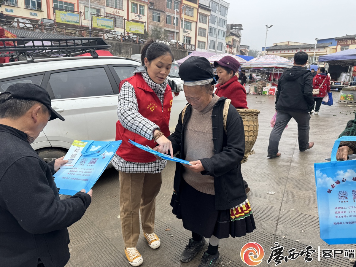 2月9日,正值南丹縣八圩瑤族鄉(xiāng)圩日。天剛亮,街上已經(jīng)熱鬧起來。集市上人聲鼎沸,攤販的吆喝聲、鄉(xiāng)親的議價(jià)聲交織在一起。在這一片煙火氣中,幾頂紅色的帳篷格外醒目,南丹縣人社局把招聘會(huì)直接“搬”到了鄉(xiāng)親們的家門口。