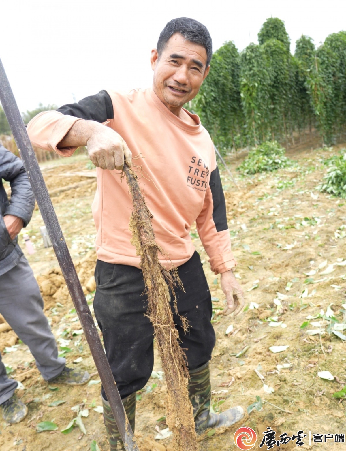 55歲的他腳踩雨鞋,手握專用鐵鍬正往土里深挖。挖到約1米深時,大半根淮山露了出來,他右手輕輕一提,整根淮山便穩(wěn)穩(wěn)出土,沾著濕潤的沙土,沉甸甸地壓手。“今天要交750公斤的貨,得趕早!彼税押梗Φ盟。