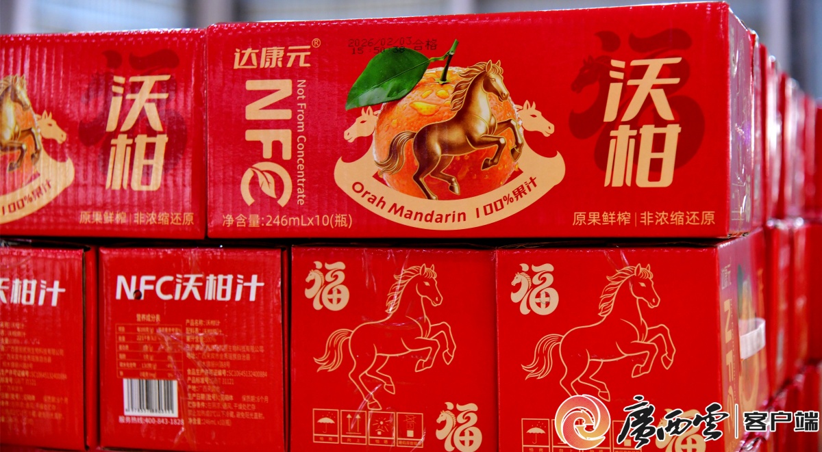 印有馬年生肖圖案限定款“新皮膚”的果汁產(chǎn)品。 深加工不僅解決了鮮果銷售難題,更延伸出高附加值產(chǎn)品矩陣。車間外,印有馬年生肖圖案限定款“新皮膚”的砂糖橘和沃柑果汁整齊碼放,即將發(fā)往春節(jié)宴席市場。據(jù)了解,目前全縣砂糖橘種植面積達(dá)14.45萬畝,依托瑤山生態(tài)優(yōu)勢,金秀從賣鮮果到賣產(chǎn)品,砂糖橘通過深加工實(shí)現(xiàn)了“身價翻倍”。下一步,金秀將推廣綠色種植標(biāo)準(zhǔn),打造區(qū)域公共品牌,讓瑤山甜蜜走向更廣闊的市場。 |