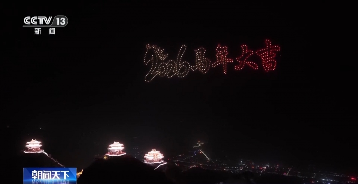 夜幕降臨,千架無(wú)人機(jī)匯聚成流動(dòng)的星河,在夜空中靈活穿梭。依次勾勒出奔跑的駿馬、祥瑞的鳳凰,“2026 馬年大吉”等字樣在天空中織就漫天星光。