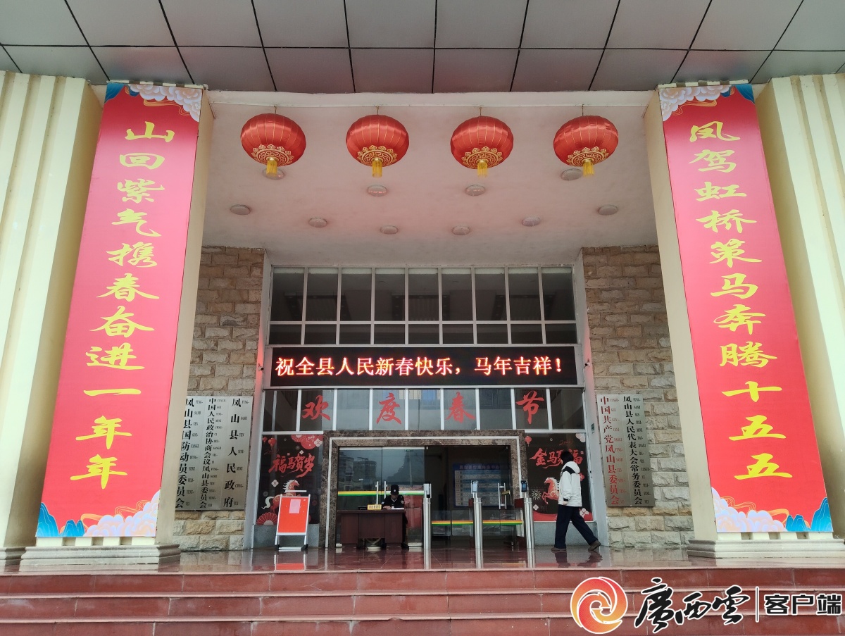 鳳山縣行政辦公中心張貼的春聯(lián)。 馬年春節(jié)將至,走在河池市鳳山縣的大街小巷,撲面而來(lái)的不僅是年味,更有各單位展現(xiàn)的新氣象。 當(dāng)別處還在張貼“財(cái)源廣進(jìn)”的通用春聯(lián)時(shí),鳳山縣黨政機(jī)關(guān)、企事業(yè)單位門(mén)口,卻換上了一副副為自家“量身定制”的春聯(lián)。這些由鳳山詩(shī)詞學(xué)會(huì)會(huì)員們集體創(chuàng)作的楹聯(lián),既馱著馬年的祥瑞,更載著時(shí)代的足音。 步入縣行政辦公中心,一副氣韻恢宏的春聯(lián)讓人眼前一亮:“鳳駕虹橋,策馬奔騰十五五;山回紫氣,攜春奮進(jìn)一年年!兵P山詩(shī)詞學(xué)會(huì)會(huì)長(zhǎng)龍泉介紹:“我們?yōu)榻賯(gè)單位創(chuàng)作專(zhuān)用春聯(lián),每一副都是集體智慧的結(jié)晶,既要對(duì)仗工整,更要對(duì)得上行業(yè)的脈搏! 在鳳山,春聯(lián)不再是千篇一律的吉祥話,而是一張張生動(dòng)的“單位名片”。 鳳山人大常委會(huì)、縣政協(xié),一副“長(zhǎng)匯民聲,駿業(yè)逢春添馬力;廣開(kāi)國(guó)策,鳳鄉(xiāng)煥彩耀龍章!睂(xiě)出了為民履職的厚重;鳳山汽車(chē)總站“馬躍新程,千里征途皆順意”的春聯(lián),讓歸心似箭的游子倍感溫暖;金牙瑤族鄉(xiāng),一副“金谷搖鈴,馬馱碩果穿云嶺”的春聯(lián),仿佛讓人看到了鄉(xiāng)村振興路上,滿載豐收的馬車(chē)穿行在云嶺之間的喜人景象。
