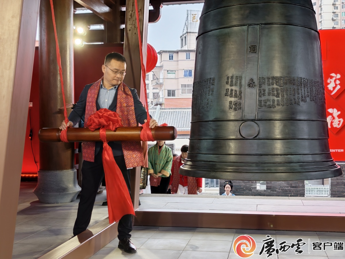 鳴鐘活動現(xiàn)場。覃海明 攝 南寧鐘鼓樓位于南寧舊城北門與南門的軸線上,原名平楚樓,最早記載見于南宋《輿地紀(jì)勝》。明朝嘉靖十年(1531),南寧衛(wèi)指揮僉事王佐召集資鑄銅鐘,懸于平楚樓上。銅鐘每次一百零八響,象征一年十二個月、二十四節(jié)氣與七十二候。2022年,南寧市啟動中山路歷史文化街區(qū)保護(hù)修繕項(xiàng)目,由南寧威寧集團(tuán)負(fù)責(zé)組織實(shí)施,鐘鼓樓作為核心工程啟動原址仿原貌重建,并在2025年對外開放。 晨鐘啟歲,福滿古城。復(fù)建的明代鐘鼓樓巍然矗立,飛檐翹角綴滿紅燈籠,與壯錦紋樣裝飾相映成趣。隨著祈福鐘聲次第敲響,市民與游客駐足靜聽,在聲聲鐘鳴中寄托平安順?biāo)、家國興旺的美好心愿。