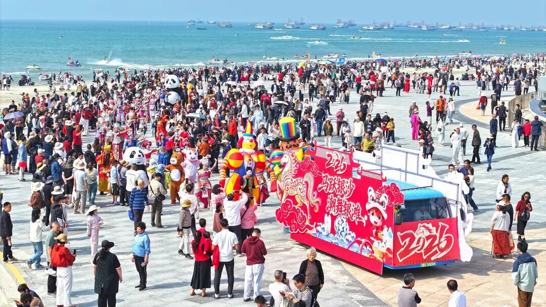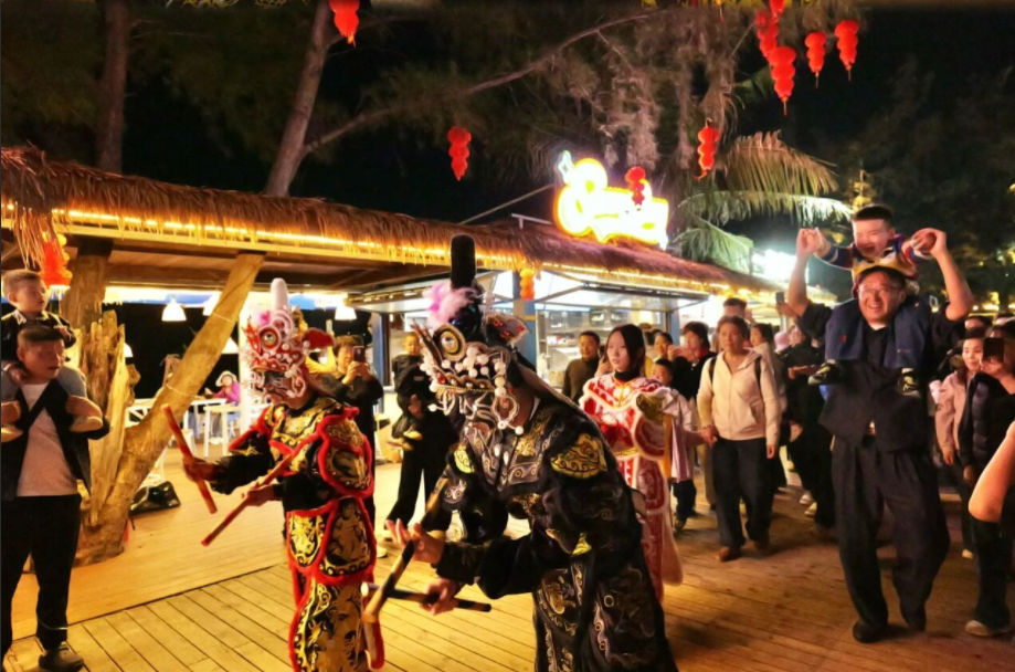 圖源:銀灘景區(qū) 隔海相望的潿洲島,則用一場場非遺盛宴震撼人心。2月17日起,南灣海洋運(yùn)動(dòng)公園的浪街上演著文化大戲:氣勢磅礴的英歌舞、神秘感拉滿的儺戲、驚艷全場的變臉吐火,打鐵花點(diǎn)亮夜空的那一刻更是令人終生難忘。國潮電音舞臺上,民樂與電音的混搭讓全場沸騰,大人小孩在草坪上蹦蹦跳跳,盡享“中國人才懂的浪漫”。