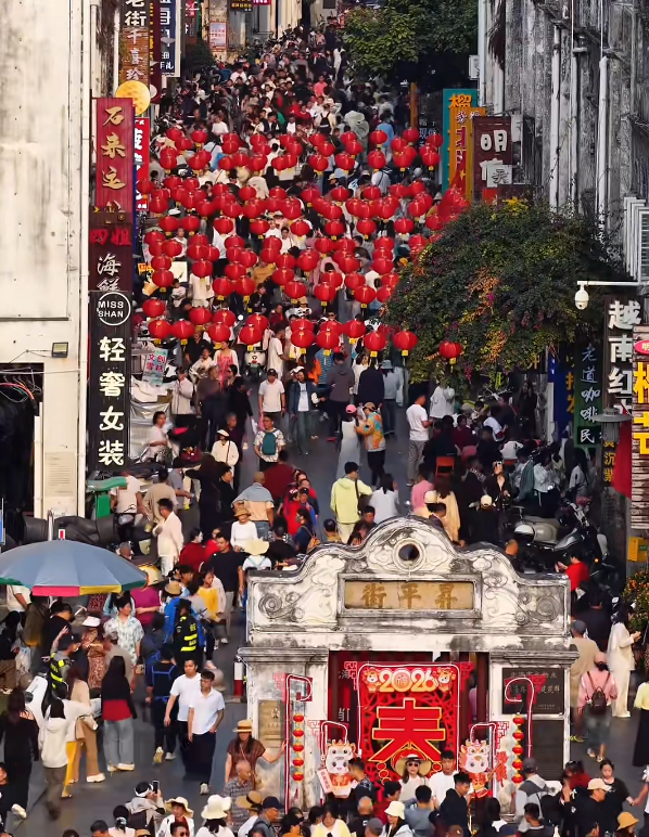 圖源:視頻號@北海圈 此外,北海園博園的十大主題新春廟會(huì)精彩不斷,從千架無人機(jī)表演到潮汕英歌舞,從奇幻稻草人到新春“殺豬宴”,日夜狂歡。以美食聞名的僑港風(fēng)情街人潮涌動(dòng),街區(qū)商鋪內(nèi),沙蟹汁、蝦仔餅等地道風(fēng)味飄香,游人紛紛品嘗“北海味道”。《印象·1876》、高德古鎮(zhèn)、海底世界、海洋之窗、月餅小鎮(zhèn)等景區(qū)同樣游客盈門,處處洋溢著喜慶祥和的節(jié)日氣氛。 每當(dāng)夜幕降臨,北海的夜空被璀璨點(diǎn)亮。銀灘的“潮”雕多媒體秀光影交織,園博園的千架無人機(jī)編隊(duì)變幻出馬年吉祥圖案,海絲首港的大型海上煙花秀絢爛綻放——北海這場集光影、科技、煙花于一體的視聽盛宴,讓游客在流光溢彩中許下新春美好愿望。