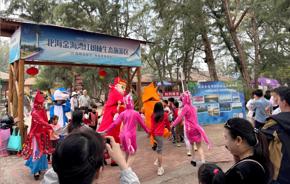 圖源:海絲首港景區(qū) 生態(tài)與年味交織的金海灣紅樹林景區(qū),同樣精彩紛呈。入口處,“財(cái)神”與身著疍家盛裝的演員們跳起《馬上有錢》舞蹈,與游客趣味猜拳送福袋。一旁的機(jī)械狗隨著音樂起舞作揖,成為打卡焦點(diǎn)。游客漫步于紅樹林棧道,或踏上金色灘涂探索沙蟹,在自然的懷抱中撿拾獨(dú)一無二的新春記憶。