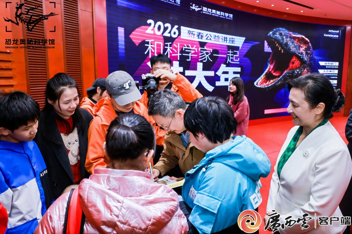 講座結(jié)束后,孩子們蜂擁而上,圍住徐星索要簽名。主辦方供圖 “恐龍是非常好的科普載體,也是激發(fā)孩子們科學(xué)興趣的‘敲門磚’!毙煨窃诓稍L中表示,希望未來有更多機會和形式,共同推動南寧的科普事業(yè)發(fā)展。他也寄語廣大青少年:保持對大自然的好奇,保持對科學(xué)的熱愛。 “這次邀請徐星院士參加‘和科學(xué)家過大年’活動,是我們系列科普活動的開端。”中國地質(zhì)大學(xué)(北京)副教授、恐龍奧秘科學(xué)館館長邢立達介紹,已邀請來自泰國、馬來西亞、新加坡等國家的古生物與地質(zhì)學(xué)專家,今年將齊聚南寧,分享探討各具特色的化石發(fā)現(xiàn),努力將恐龍奧秘科學(xué)館打造成標(biāo)志性的公眾科普平臺。 據(jù)悉,2月14日至21日,由南寧市科學(xué)技術(shù)協(xié)會、廣西規(guī)劃館主辦,恐龍奧秘科學(xué)館策劃并承辦的“科學(xué)家面對面”系列新春特輯活動“和科學(xué)家一起過大年”在廣西規(guī)劃館恐龍奧秘科學(xué)館舉行;顒犹匮煨窃菏,攜手廣西自然博物館副館長莫進尤、中國地質(zhì)大學(xué)(北京)副教授邢立達等權(quán)威專家,連續(xù)舉辦公益科普講座,為廣大市民和游客送上一份獨具匠心、年味十足的科學(xué)文化大禮。 |