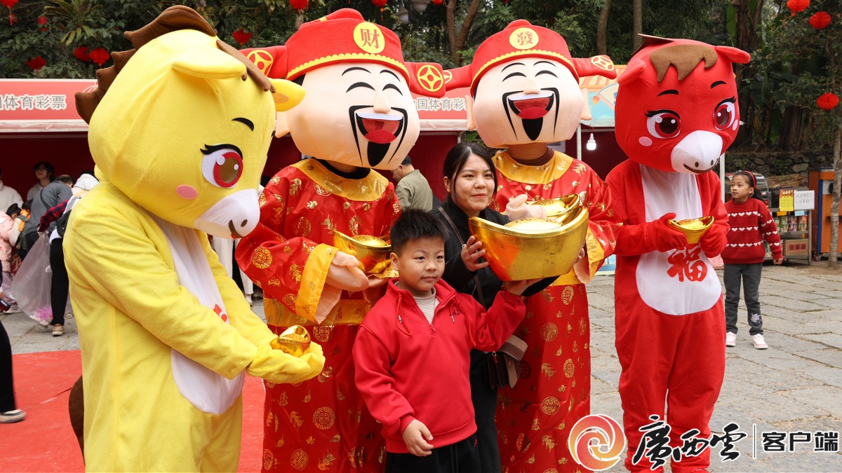 桂平西山風(fēng)景區(qū)人潮如織。通訊員 黃煜婷 覃柏創(chuàng) 攝 大年初一上午,桂平西山風(fēng)景區(qū)已是人潮如織!靶麓簢毖灿巍痹诖死薰膯⒛唬碇鴩狈椀年犖檠丶t毯巡游,向游客派送開運(yùn)紅包。主舞臺區(qū)域上演“迎春雅韻匯演”,古箏、琵琶等器樂演繹國風(fēng)經(jīng)典,更有書法大家現(xiàn)場揮毫潑墨,吸引眾多游客駐足欣賞。同時,身著國潮服飾與玩偶服的工作人員們在人群中穿梭巡游,與游客親密互動,派發(fā)開年禮品。
