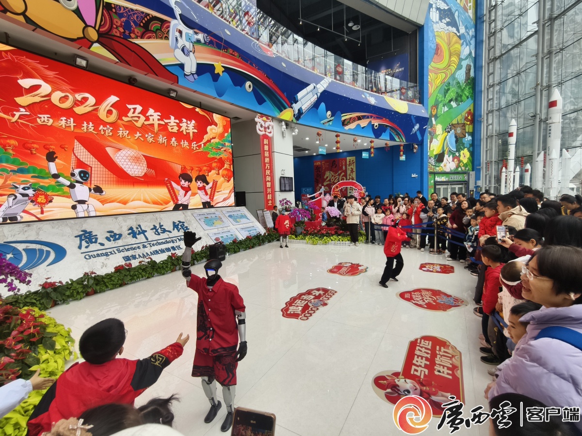 今年春節(jié)期間,廣西科技館的機器人登臺表演舞蹈和武術,行云流水的動作,剛柔并濟的招式,大朋友和小朋友都看呆了!攝制:廣西云-廣西日報記者 羅婧 2月20日,大年初四,剛邁進廣西科技館的大門,記者就被序廳里三層外三層的人群“攔截”了。人群中還不時爆發(fā)出驚呼和掌聲,這陣勢,是有“大咖”空降? 擠進去一瞧,舞臺中央站著4個穿著喜慶的機器人,時而抬起腳,時而揮揮手,仿佛在做“熱身”動作。警戒線旁的小朋友已經(jīng)等不及了,拽著母親的衣角問:“媽媽,什么時候才開始呀?”