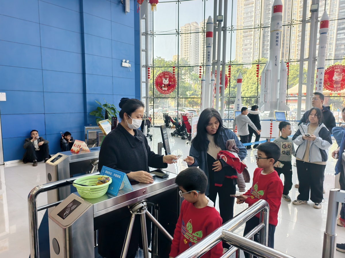工作人員春節(jié)也在堅守。廣西云-廣西日報記者 徐天保 攝 廣西科技館展教部副部長蘇超就是其中之一。自2008年科技館對外運營以來,他幾乎每年春節(jié)都在值班。布展、檢查展品、確保設備正常運轉……這些看似瑣碎的工作,他一干就是十多年。 “過年觀眾多,值班已經(jīng)是常態(tài)了!碧K超笑了笑。他說這些年最大的感受是“變化”:展品年年更新,AR、VR、人工智能等技術應用越來越廣泛;來看展的也不再只是孩子和家長,越來越多的年輕人,甚至老年人也愿意走進來!斑@說明大家的科學素養(yǎng)在提升,對知識的渴求越來越強!