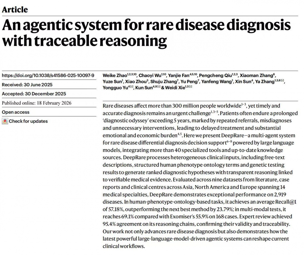 2月19日凌晨,上海交通大學(xué)醫(yī)學(xué)院附屬新華醫(yī)院孫錕教授、余永國教授領(lǐng)銜團(tuán)隊(duì)與上海交通大學(xué)張婭教授、謝偉迪副教授領(lǐng)銜團(tuán)隊(duì)聯(lián)合研發(fā)出一款能看罕見病的人工智能系統(tǒng),相關(guān)成果北京時(shí)間2月19日在國際頂尖期刊《自然》上發(fā)表。這套名為DeepRare的系統(tǒng),被稱作全球首個(gè)“推理過程可追溯”的罕見病智能醫(yī)生。