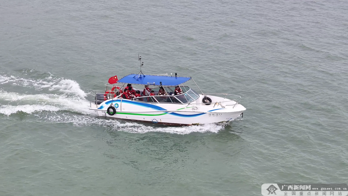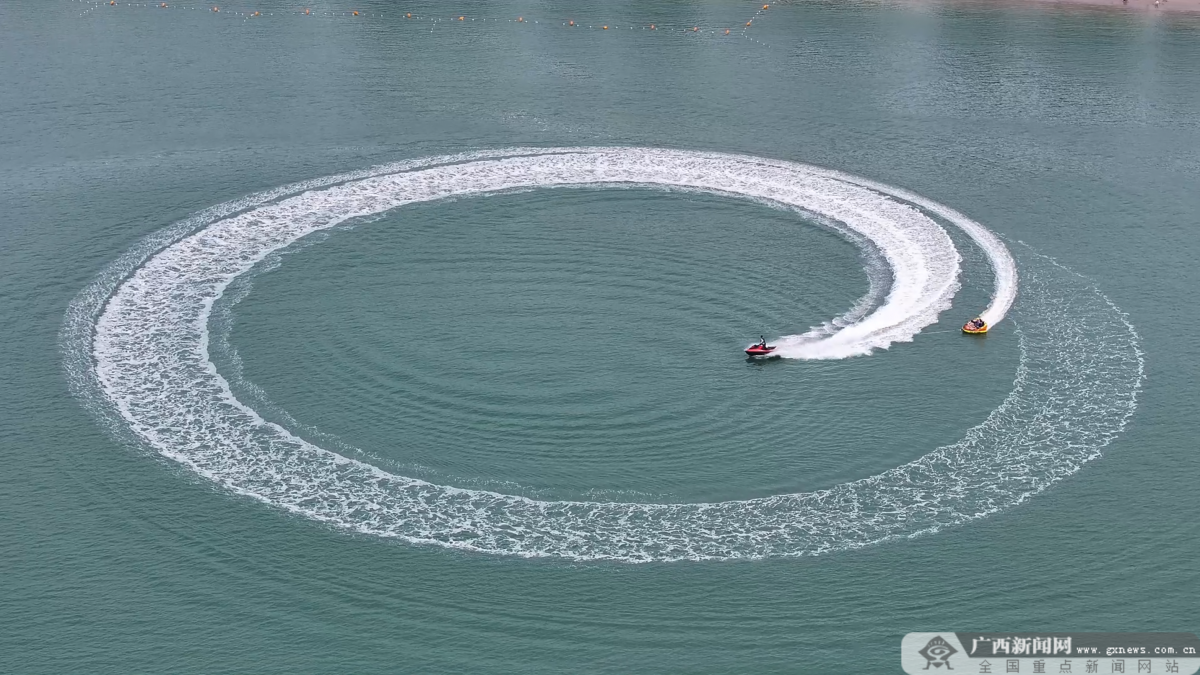 海面上,摩托艇飛馳,拖出長長的白色浪尾。羅煉新 攝 “我們那兒現(xiàn)在零下十幾度,這里卻溫暖如春!眮碜詵|北的游客張女士舉著手機對著海面不停地拍攝,興奮地說這是她第一次來到欽州,過了一個暖和的大年。