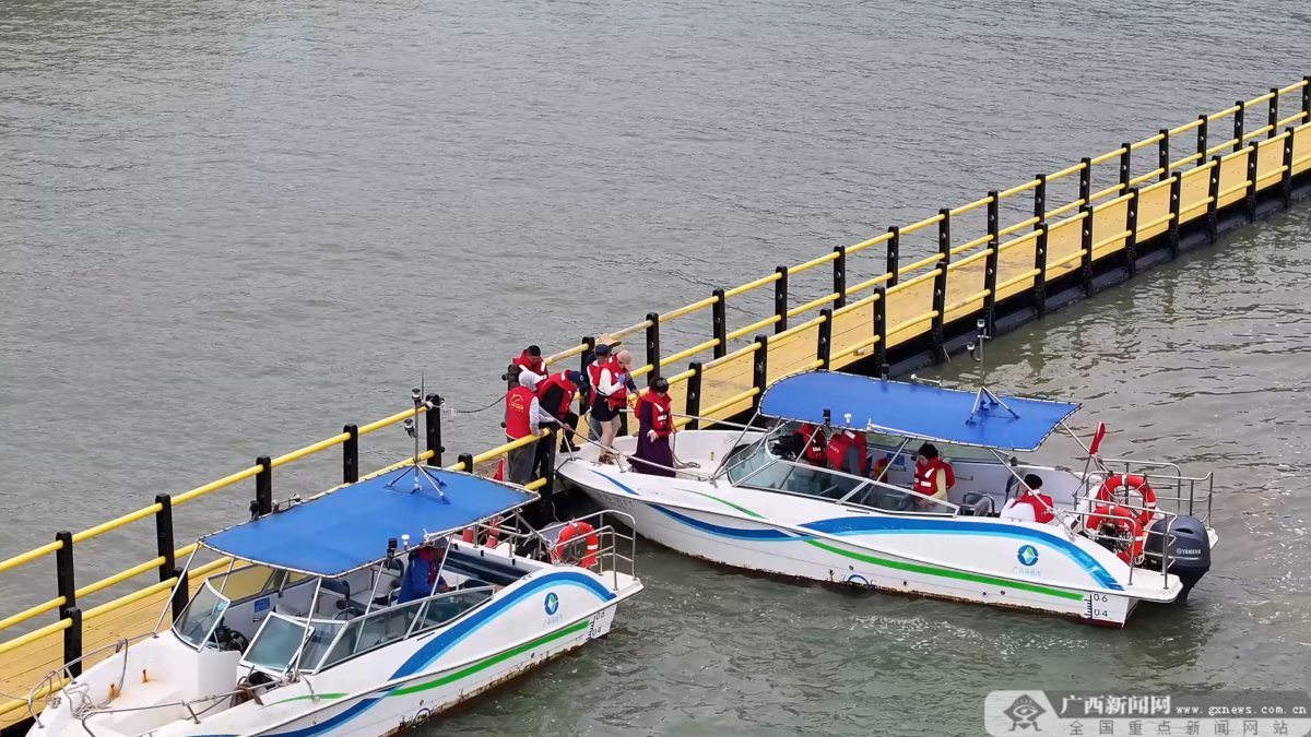 游客有序登船出海尋豚。羅煉新 攝 面對火爆的客流,景區(qū)迅速啟動應對機制。廣西旅發(fā)海豚灣旅游投資有限公司當天早上發(fā)布公告稱,截至當日8時15分,“出海尋豚”項目接待量已接近飽和,正采取限流措施,關(guān)閉所有售票通道,F(xiàn)場志愿者也在引導未購票游客分流至周邊景點游玩。
