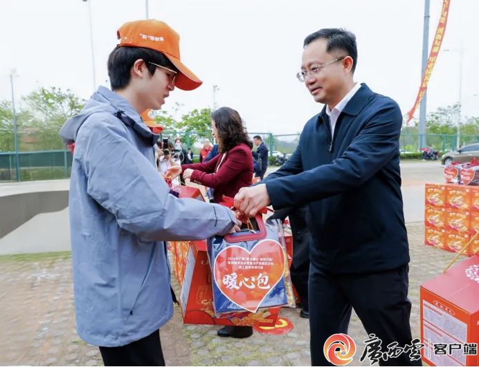 自治區(qū)人力資源社會保障廳黨組成員、副廳長韋杰為務工人員送上“暖心包”。