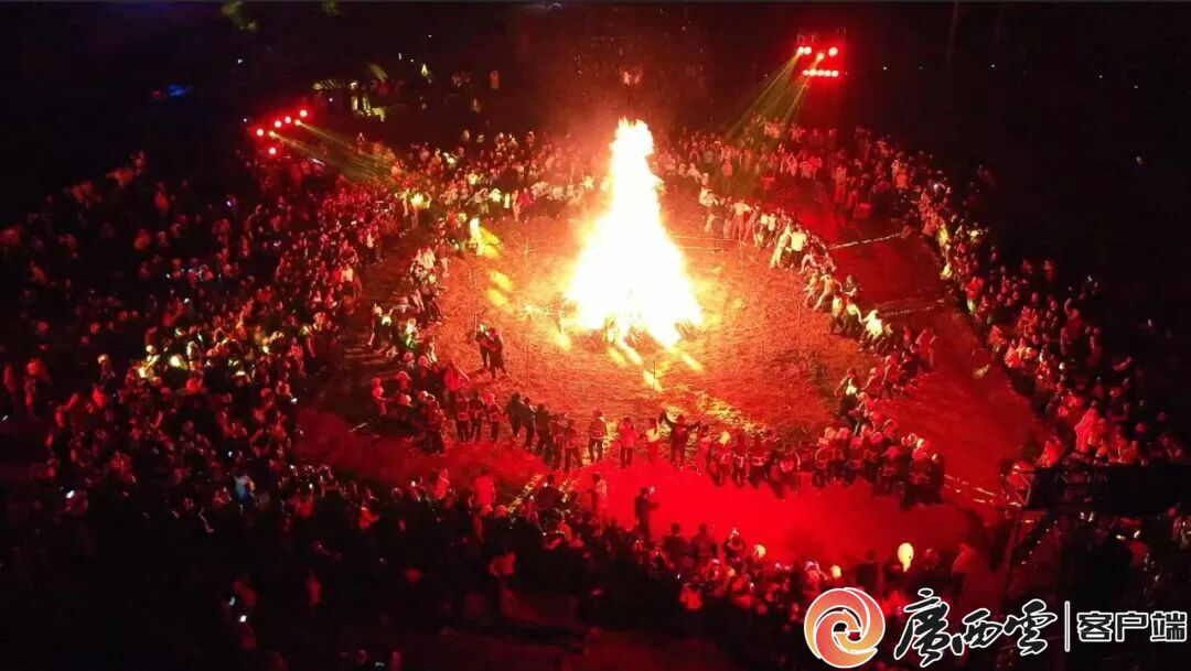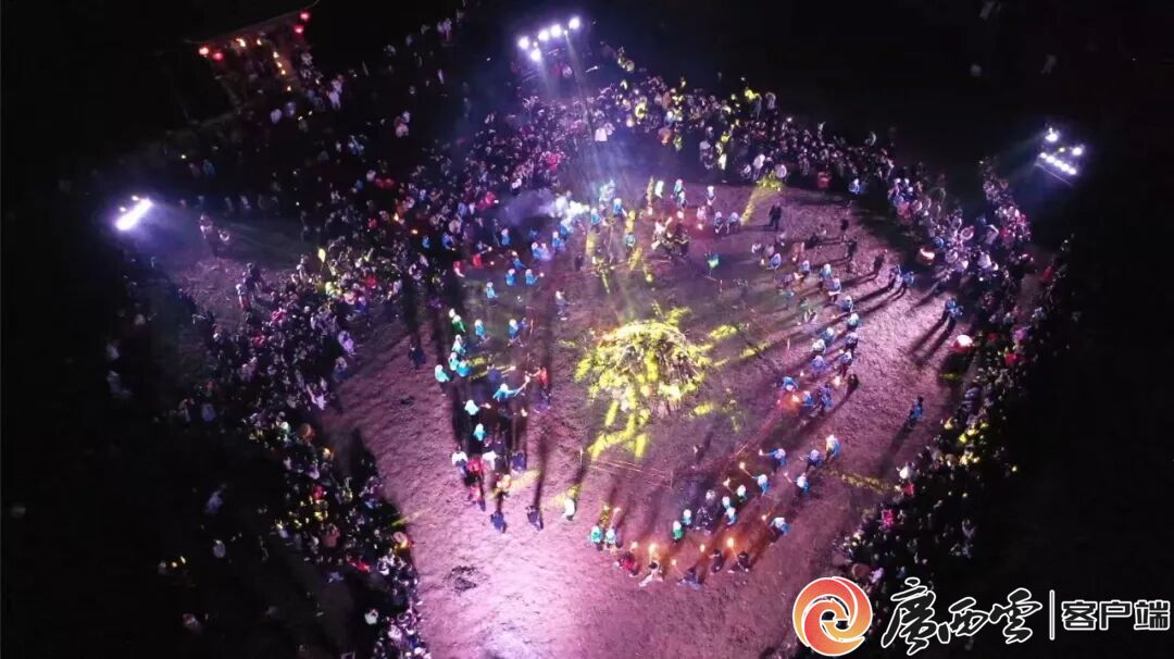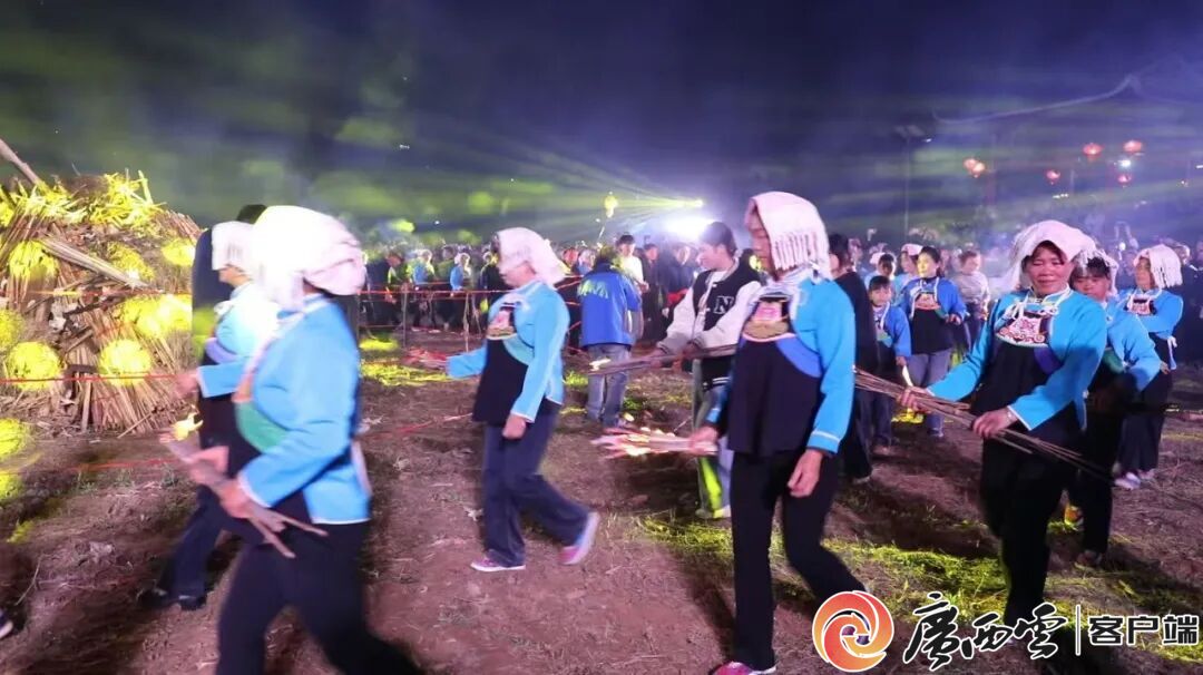 螞𧊅民俗文化節(jié)活動現(xiàn)場。 火把游田垌活動寓意深長,是壯鄉(xiāng)走村串戶、火龍驅(qū)邪、互報平安的傳統(tǒng)儀式。村民們高舉火把游走田間,既為驅(qū)瘟避害、趕走蟲災,也借火龍喚醒沉睡的螞𧊅,提醒各家各戶注意防火、籌備農(nóng)耕。隊伍從螞𧊅圣母廟啟程,挨家挨戶傳遞溫暖祝福,最終回到納魯屯主會場,用火把拼出巨型螞𧊅圖案。
